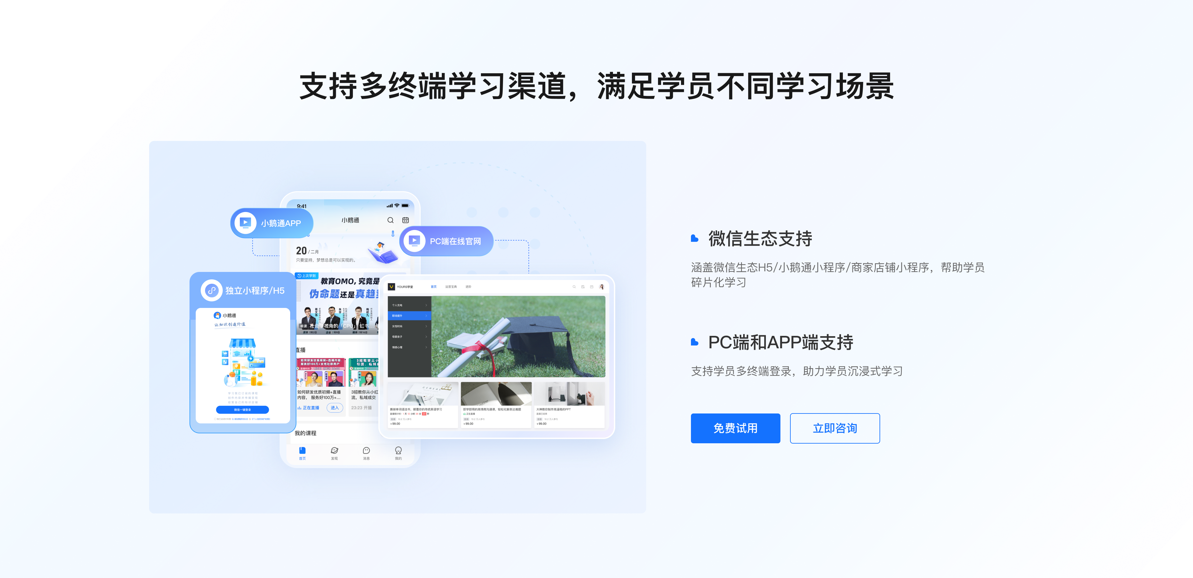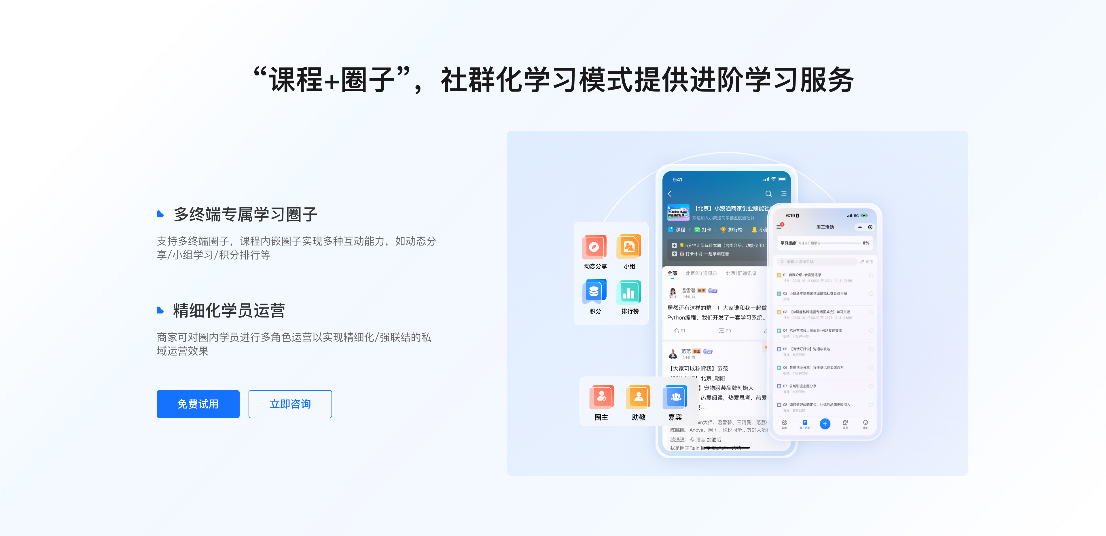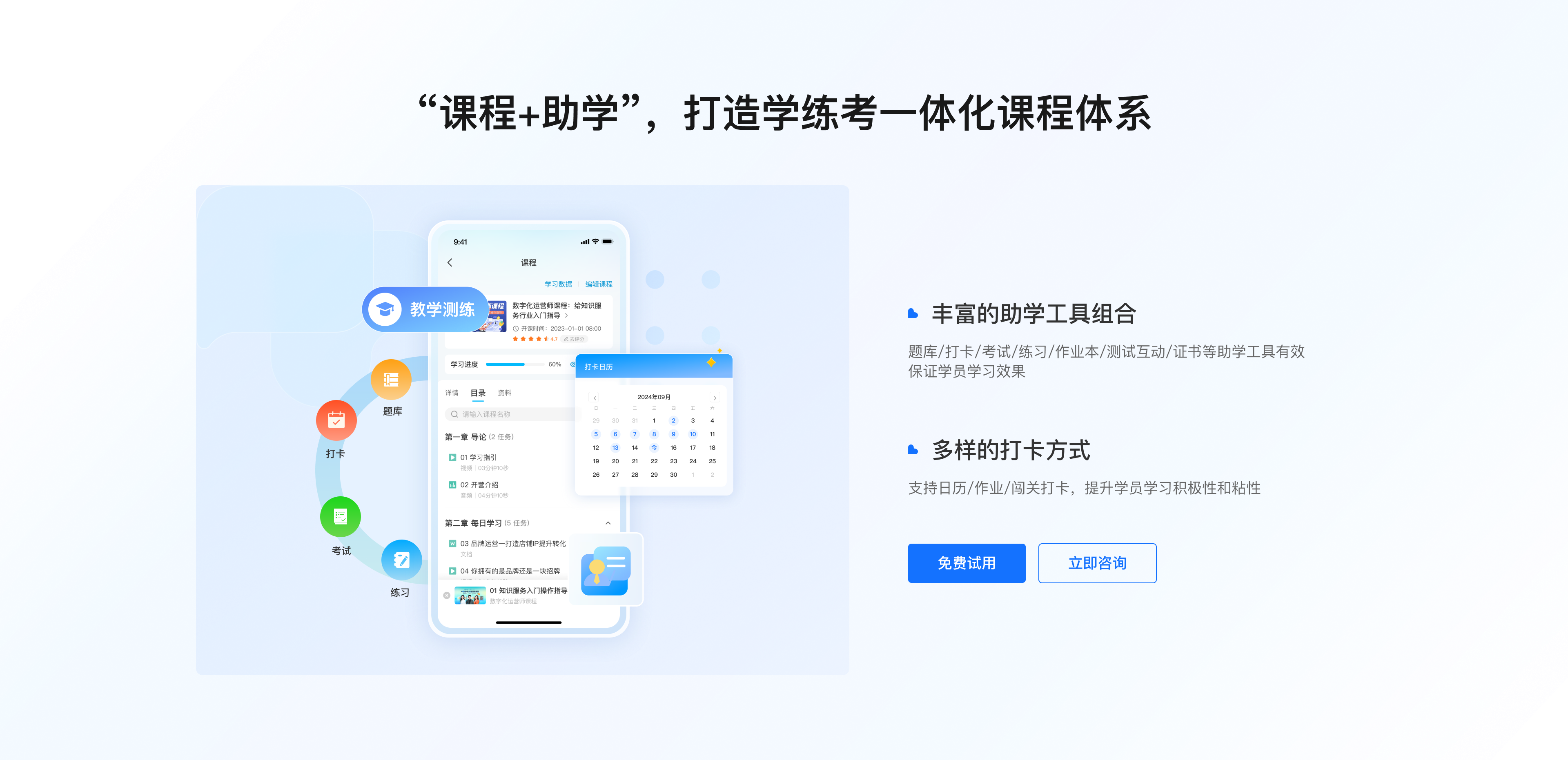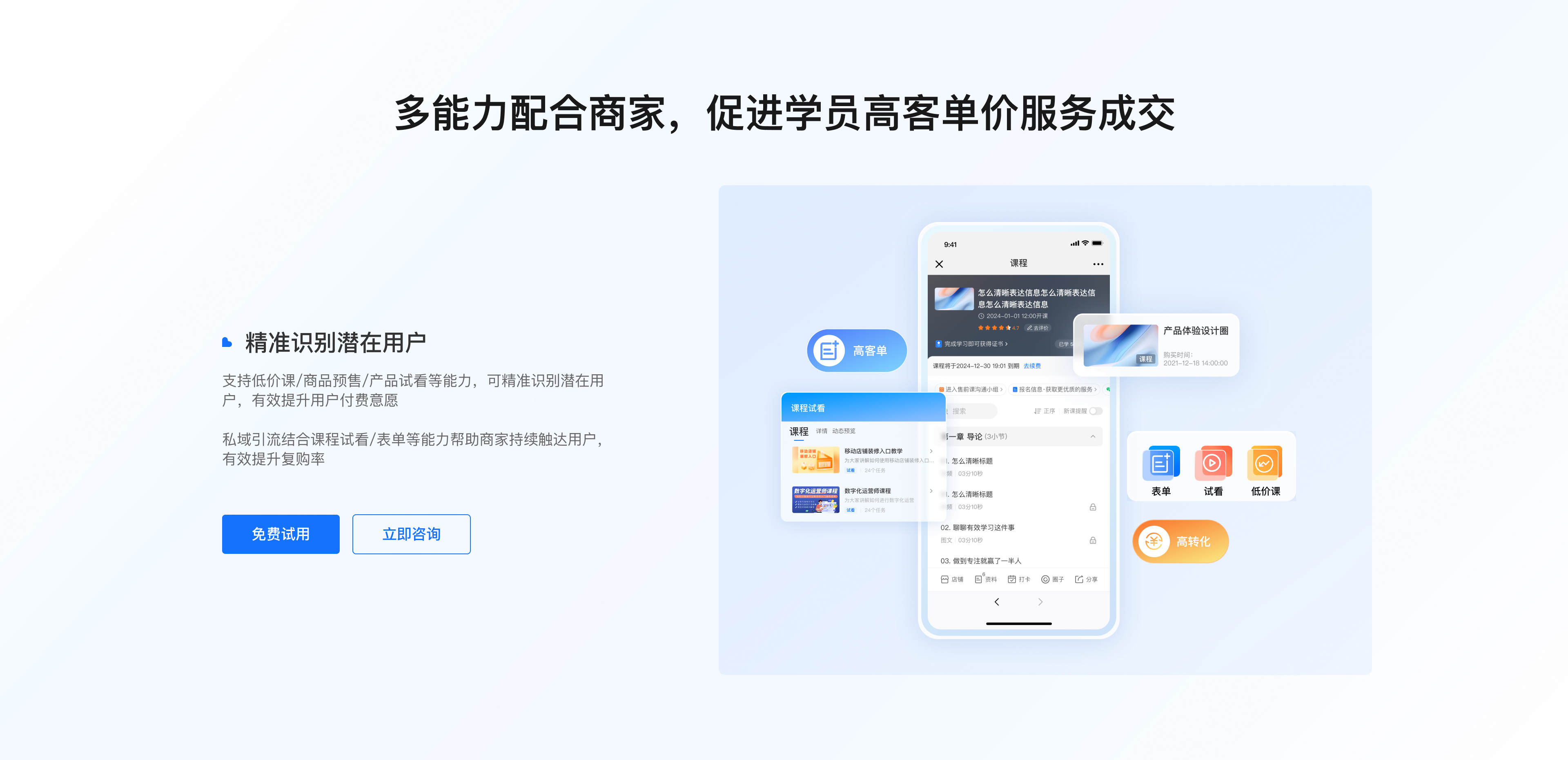 【销转闭环・线索不浪费】全渠道线索统一接入、智能分配跟进,熟客自动锁定,跟进更高效;用户行为实时打标分层,观看时长、领券、下单、留资一键识别高意向;未到课、卡单、待支付等关键行为实时提醒销售,分钟级召回挽回订单。